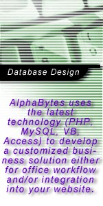 AlphaBytes offers high-end technology solutions for small to medium sized businesses. Let ABCS design a solution that helps get your business connected on the web, or develop a database that eases business flow and/or facilitates marketing... OR BOTH!!!!